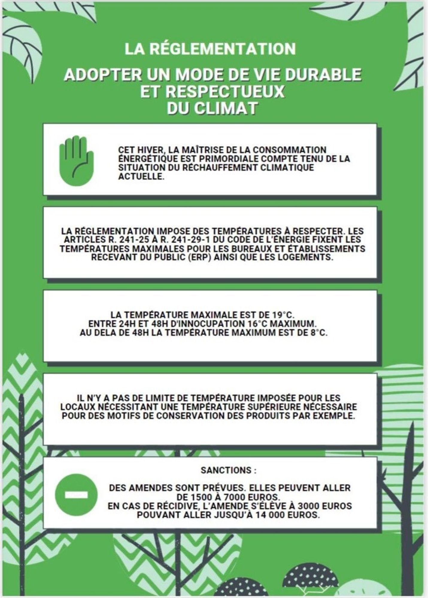 Règlementation chauffage : Adopter un mode de vie durable et respectueux du climat 31 décembre 2022 Bonjour à tous, Cette semaine on vous propose une sublime affiche relative à la règlementation sur le chauffage. On espère que celle-ci saura éveiller votre curiosité. Le groupe COM vous souhaite un très joyeux réveillon du nouvel an !