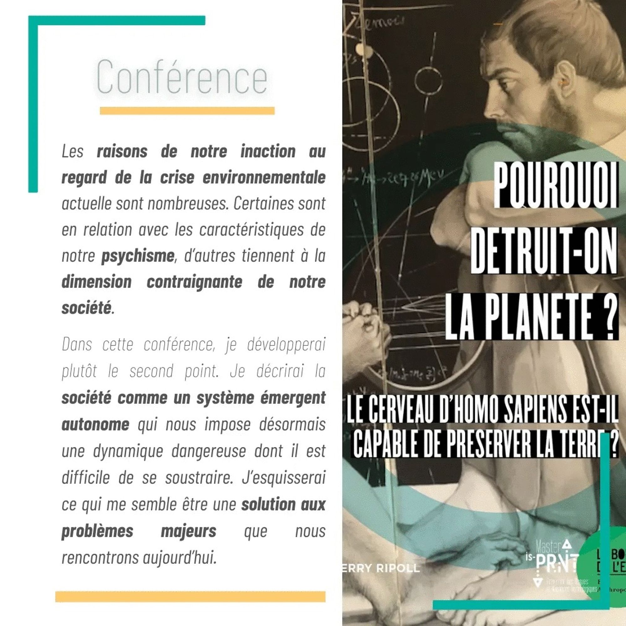 L'association ECOUNIV13 et le Master isPRNT ont le plaisir d'accueillir Thierry RIPOLL, professeur de psychologie cognitive et sciences cognitives, essayiste et conférencier pour une conférence-débat où l'on s'intéressera aux obstacles à la gestion rationnelle de la crise #environnementale actuelle. ☘️♻️ 👉💡